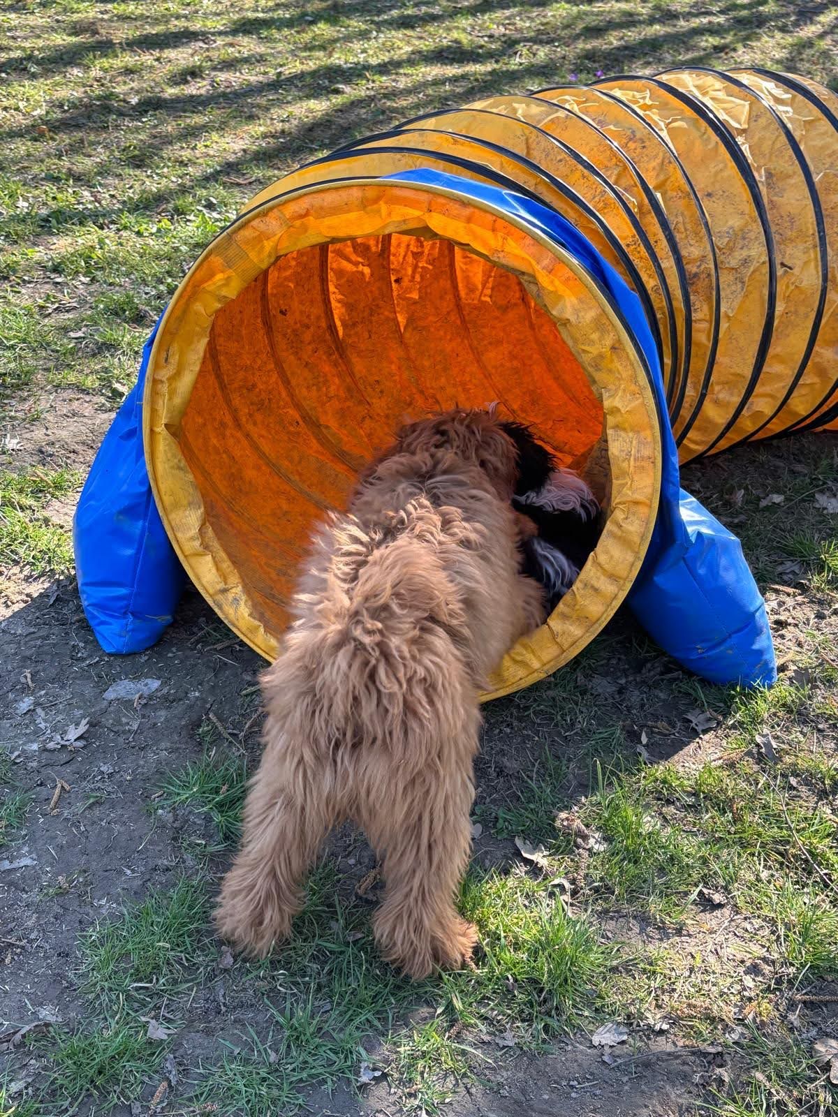 Der "Abenteuerspielplatz" mit Tunnel, Wippe, Wackelbrett, verschiedenen Untergründen etc. macht aus ihrem "Fellknäuel" einen unerschrockenen, selbstsicheren Hund.